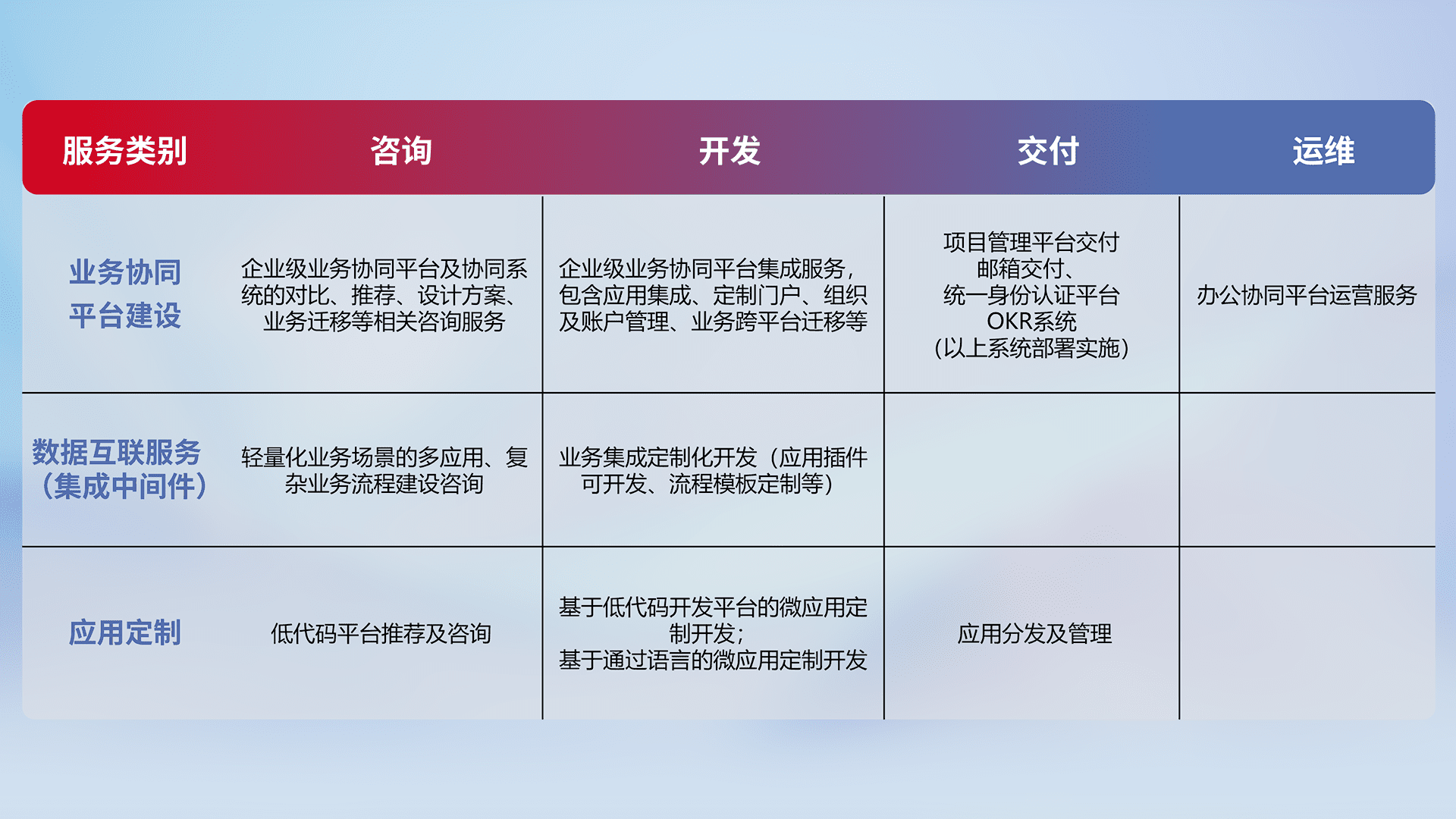 针对钉钉、、、企微、、、IDaas等平台级产品提供产品的规划、、、、方案、、、、交付、、、定制化开发等服务,,实现如统一协同办公、、、、智能客户服务、、混合会议管理、、、智能数据查询、、、等业务场景,,,,实现数字化转型。。。。